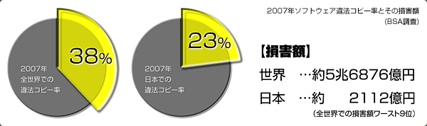BSA(BusinessSoftwareAlliance)による調査では2007年の全世界での違法コピー率は対前年比3ポイント増の38%、損害額は21%増の約482億ドル(約5兆6876億円)、日本での違法コピー率は23%、損害額は約2,112億円(全世界での損害額ワースト9位)に及ぶと報告されています。